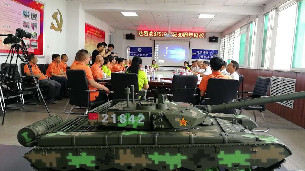 上午8:10,“30载同窗再聚首联谊会”,首先在“树木认购和文化石捐赠”仪式中拉开帷幕。中北大学校长沈兴全,校党委副书记薛智、校友办主任张胜利、机械工程学院院长祝锡晶,以及21842班班主任李兵义老师等校院领导及老师出席仪式。 捐赠仪式结束后,21842班首任班长王兴亮及筹委会同学,带领21842班同学参观了校园,并回到原来的教室宿舍,重温34年前的青葱岁月。 上午9:30,21842班与会28名同学,与沈兴全校长、薛智书记、校友办主任张胜利、机械工程学院院长祝锡晶、班主任李兵义及王爱玲,杨波,张春明,王俊元,刘兴来,张吉堂等各位老师等进行了座谈。大家回顾过去、畅谈现在、展望未来,浓郁的感恩感谢、友情亲情充满了整个座谈活动。座谈会前,王兴亮班长代表21842班同学向母院捐赠了国产主战坦克模型,象征着母院在高教战线上,一往无前冲锋陷阵。 座谈会上,沈校长着重介绍了学校的良好现状和十年发展大计。21842班同学向在座的老师献花并简要介绍了自己的工作生活,畅谈了30载酷暑寒冬多少悲忧,30年春华秋实多少喜乐,各位老师也对同学们的情意表达了感谢和期望。 下午2:00,聚会同学游览母校周边景点后,驱车前往梅苑山庄,开展文艺表演、龙舟赛等自娱自乐联谊活动。