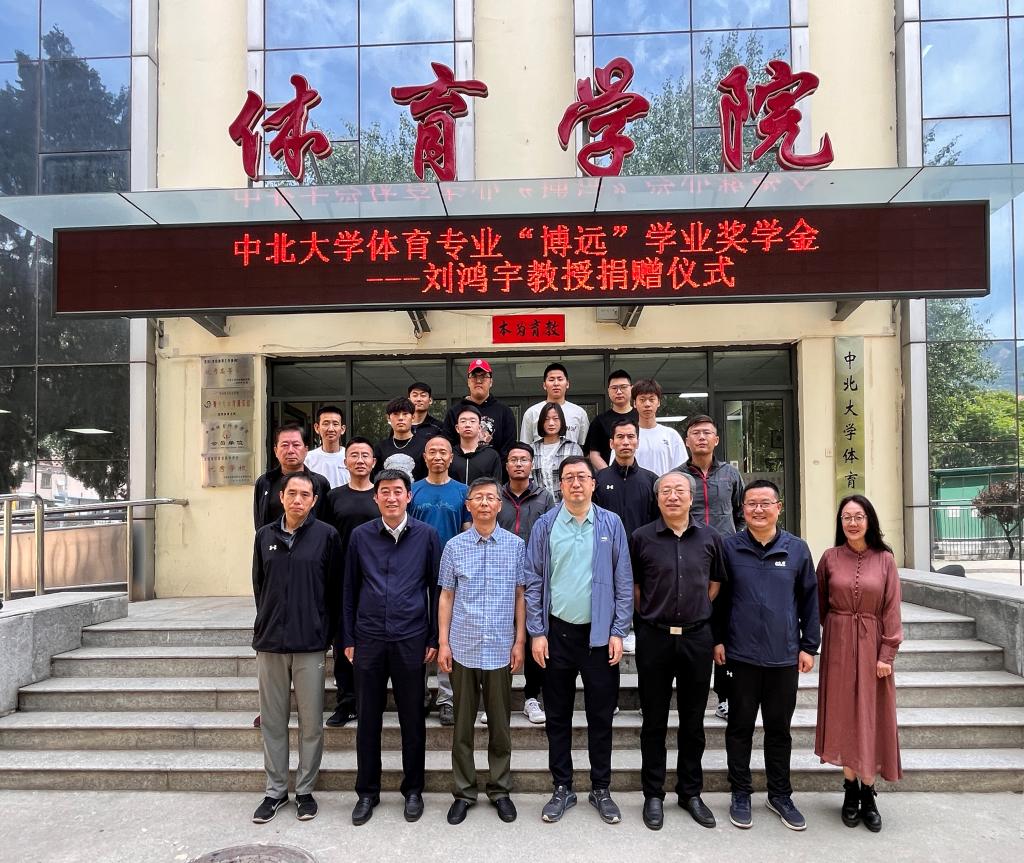 2023年6月3日上午,国内交流合作部与体育学院共同为刘鸿宇教授举行 “博远”学生奖励基金捐赠仪式。副校长刘俊,中北大学教育发展基金会理事长薛实军、副秘书长刘新妹;体育学院刘鸿宇教授,院长吴剑、党委副书记贾鹏,以及体育学院师生代表20余人参加捐赠仪式。