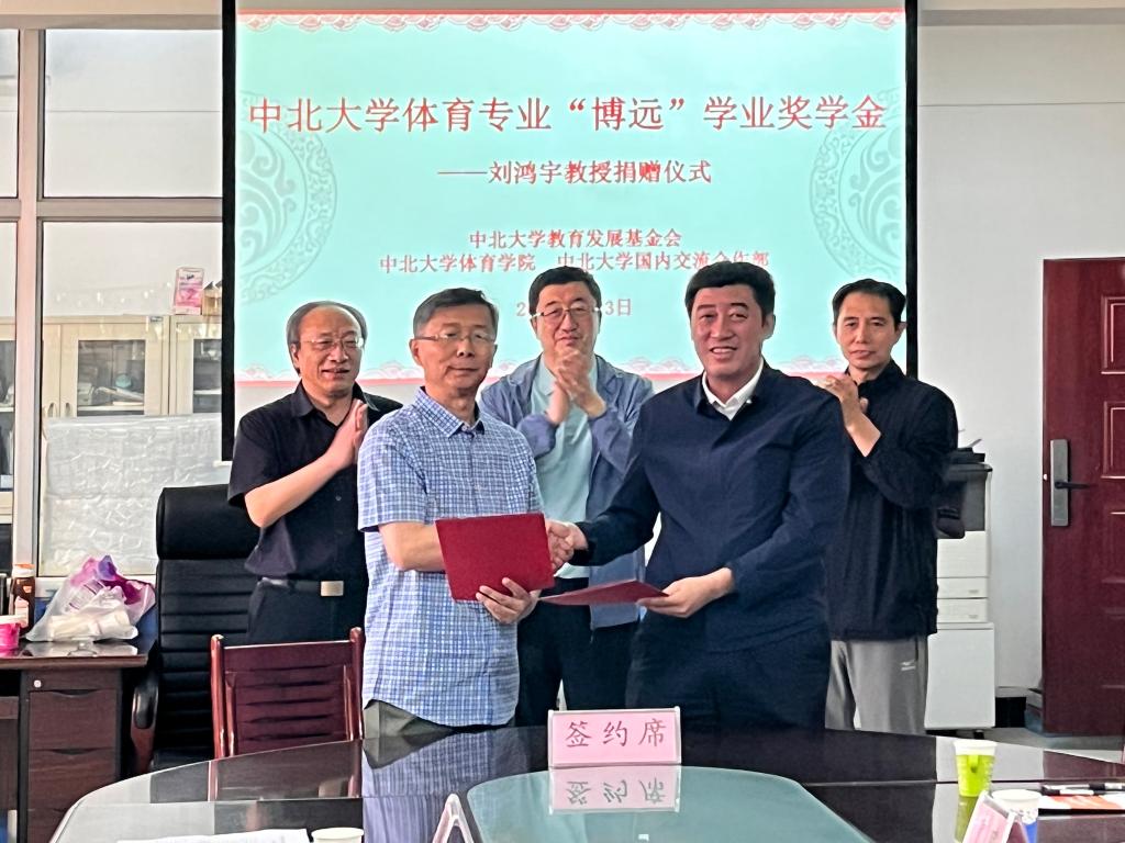 捐赠仪式由国内交流合作部部长刘国东主持, 刘部长介绍并阐释设立中北大学体育学院“博远”学生奖励基金的背景意义;刘新妹代表教育发展基金会介绍了本基金的设立办法、奖励程序、受奖范围等;捐赠人刘鸿宇教授阐述了设立该基金的初衷和目的,旨在鼓励我校体育学院学生发奋学习,拼搏进取;刘教授在讲话中感谢20多年来学校为自己搭建的发展平台,他时刻关心体院的学子和学院的发展,期望通过此举为学院的高质量发展尽一份力量。