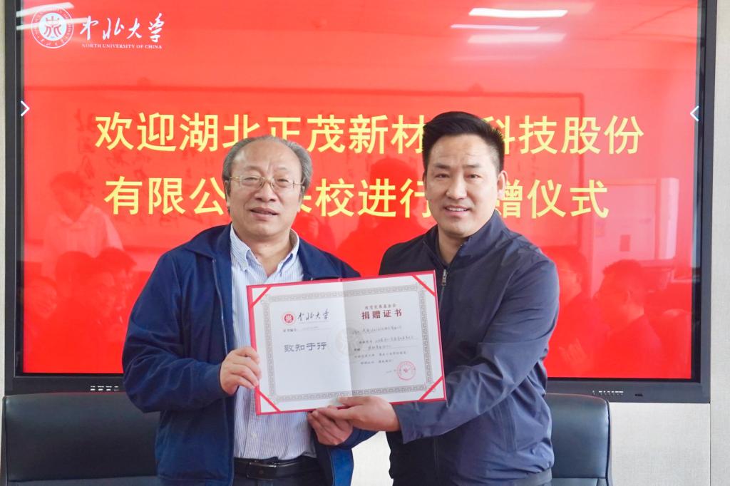 仪式上,中北大学副校长尹建平致欢迎辞后,双方共同观看学校宣传片。中北大学教育发展基金会理事长薛实军与湖北正茂新材料科技股份有限公司副总经理任超现场签订捐赠协议,并向企业颁发捐赠证书。根据协议,该公司自2025年起每年捐赠10万元设立专项助学金,定向支持中北大学湖北籍优秀贫困学子完成学业。