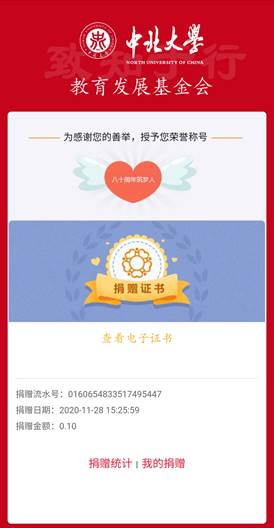 点击【查看电子证书】,可显示自动生成的捐赠证书(如下图),至此为完整捐赠流程。