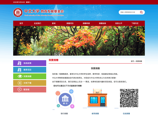 进入中北大学教育发展基金会网站,首页点击捐赠入口进入【我要捐赠】页面,用户可根据自己的方便需求通过选择支付宝、微信扫码进入移动端捐赠系统,完成在线捐赠。