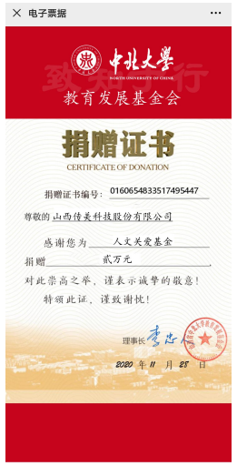 四、捐赠方按照捐赠协议要求将捐赠资源转中北大学教育发展基金会,基金会收到后及时在中北大学基金会官网主页公示,并按国家相关规定开具公益事业捐赠发票及接收证明等;