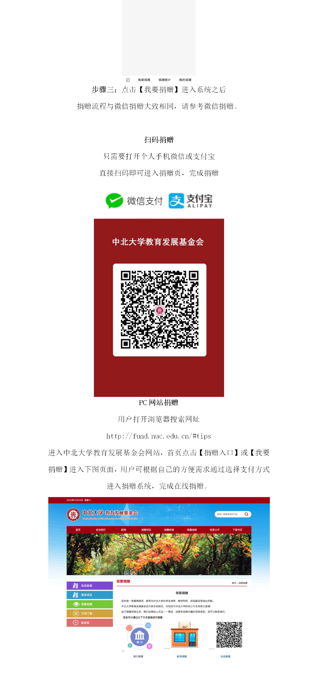 值中北大学喜迎建校80周年校庆之际,为助力学校争创双一流大学,满足广大师生、校友和社会各界人士的关爱与支持,中北大学教育发展基金会已于2020年12月26日正式开通在线捐赠功能(微信、支付宝、PC端),欢迎广大在校师生、海内外校友和社会各界献分毫爱心,聚万千希望,共同为中北大学的发展贡献自己的一份力量,扫码可直接捐赠。