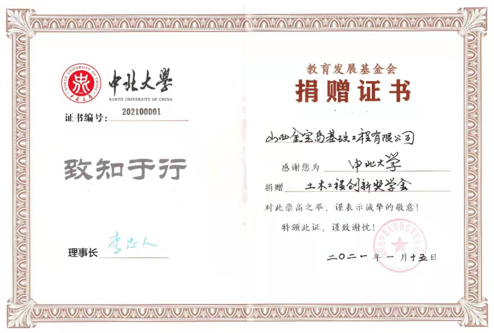 为支持和推动中北大学教育事业的发展,2021年1月15日山西金宝岛基础工程有限公司向中北大学教育发展基金会捐赠壹拾万元人民币,用以设立中北大学“金宝岛基础-土木工程创新奖学金”。